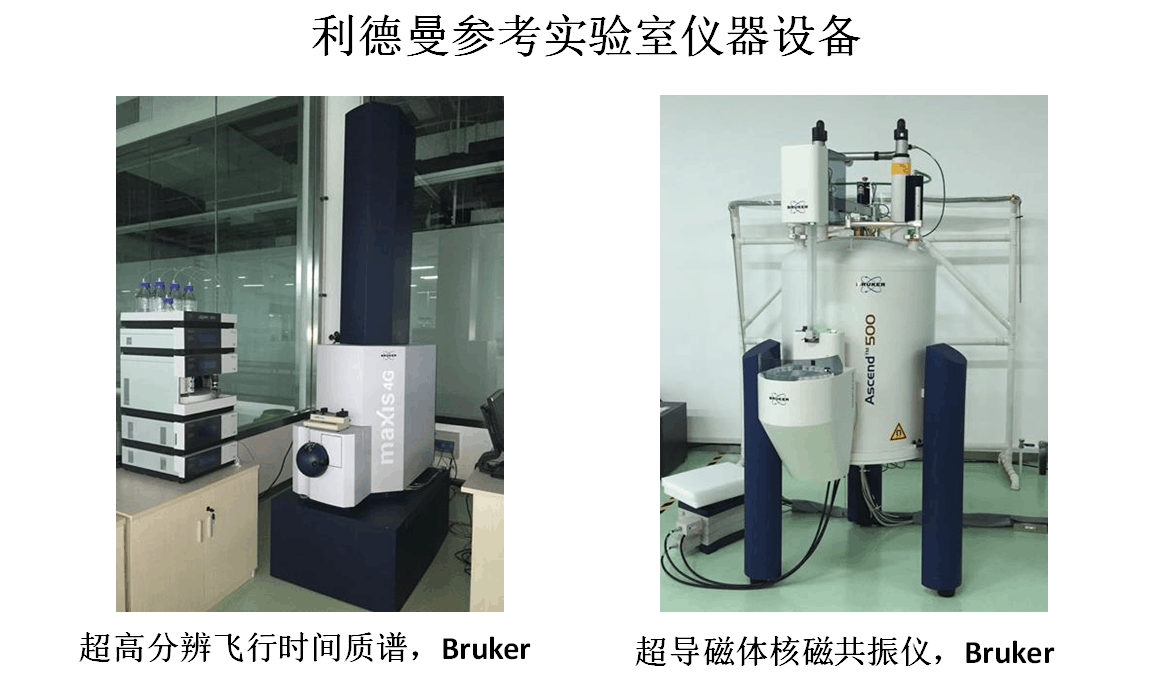 参考实验室拥有一系列高端、精密的检测设备来保障完成以上各项工作。如岛津紫外-可见分光光度计、岛津原子吸收分光光度计、罗氏E411电化学发光免疫分析仪、日立7180全自动生化分析仪等。此外,还拥有电喷雾四级杆飞行时间质谱仪、核磁共振仪、液相色谱仪等,可以对小分子进行的精准的检测。