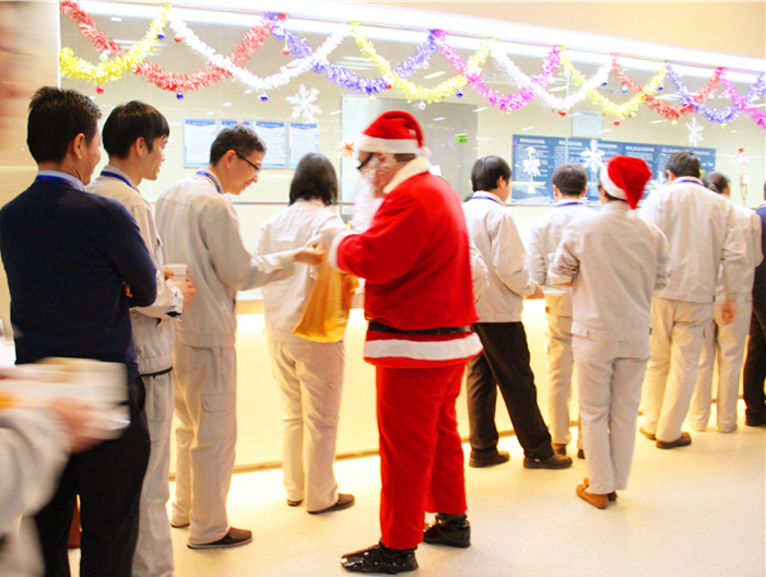 12月25日中午,行政办公室将员工餐厅精心布置了一番。餐厅里挂满了闪亮的灯,墙壁上也应景的贴上了圣诞快乐的祝福语,电视上播着世界各地欢庆圣诞节的幸福画面,耳边回荡着充满节日氛围的欢快音乐。